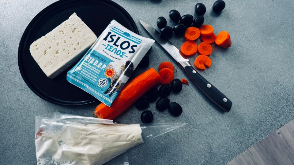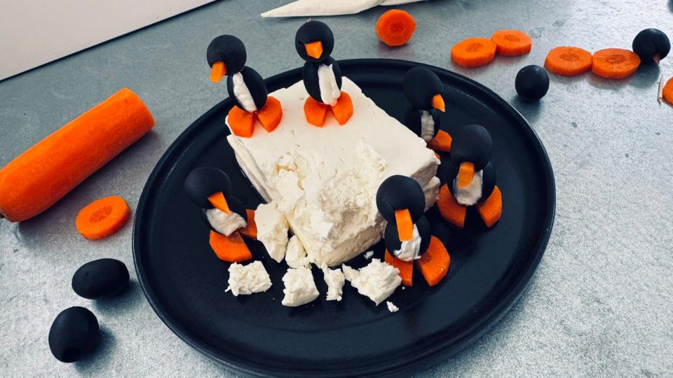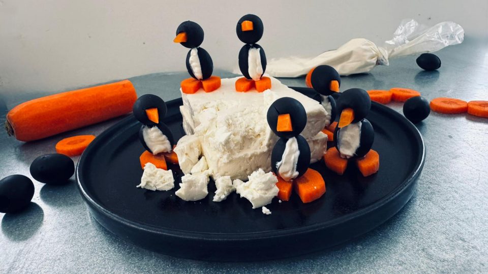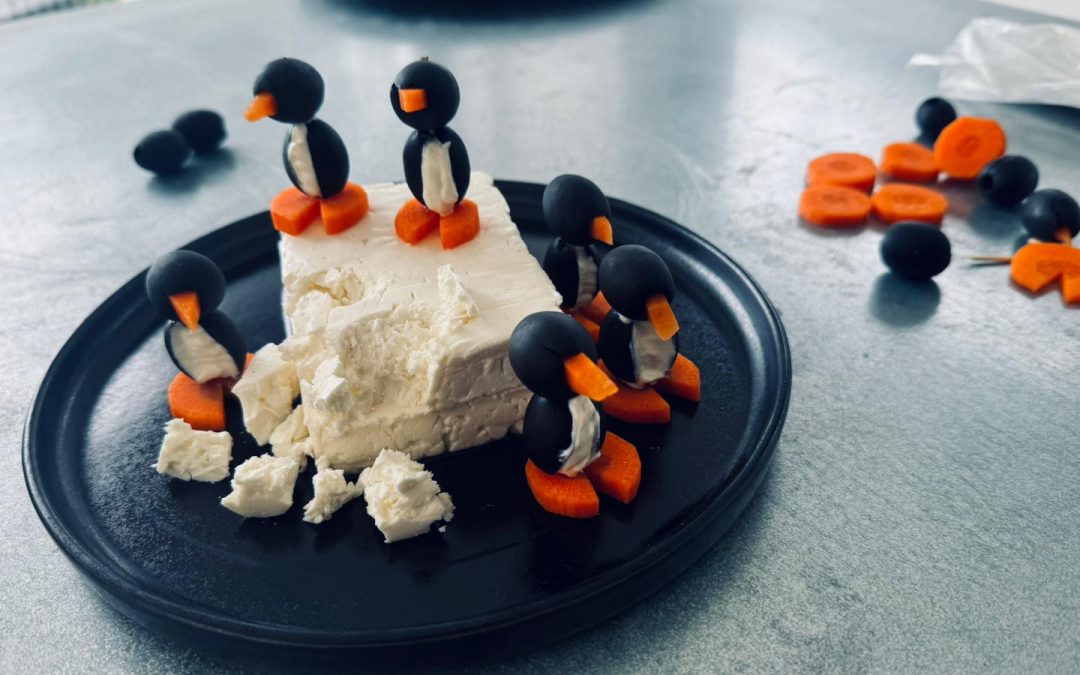 En la época Navideña solemos dedicarle más tiempo a la cocina que el resto del año. Nos preocupamos por tener una mesa vistosa, tanto en Nochebuena como en Navidad, para sorprender a familiares y amigos. Pero tenemos a los pequeños, que siempre tienen ganas de participar. Para ellos, os proponemos este sencillo aperitivo que con un poco de habilidad pueden hacer ellos mismos. Quizás, lo más complicado sea hacerle el corte a las aceitunas, que se las podemos proporcionar ya cortadas, así como los triángulos de zanahoria. El resultado es un aperitivo divertido que combina aceitunas y queso. Nosotros hemos usado queso griego, más concretamente Feta D.O.P que hemos conseguido en el Gadis. Ahora los pequeños ya pueden participar en el menú navideños montando este paisaje polar con pingüinos incluidos.