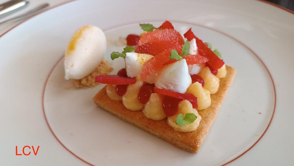 Comenzamos con una tartleta merengada, ruibarbo y cítricos. Frequito para compensar el día y la abundante comida.