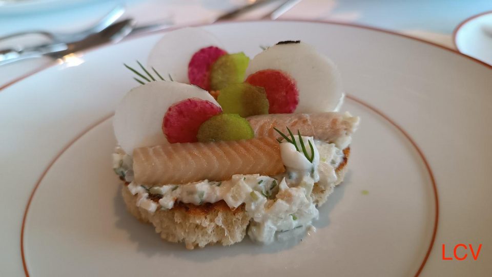 Anguila ahumada, brioche, manzana y rabanitos. Un entrante sabroso y equilibrado que hace un homenaje a los peces de río que se encuentran al lado y a su tradicional ahumado.