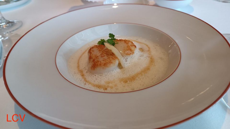 Vieiras, espárragos y mantequilla blanca. Plato elegante y sutil en el que se nota la estrella Michelin de Pedro Lemos y su buen hacer.