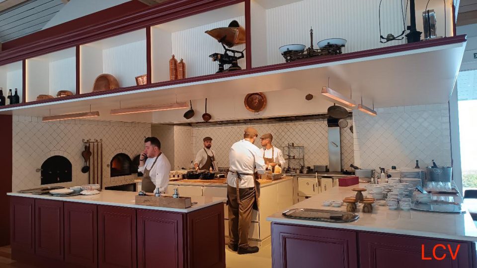 La cocina está a la vista y la presiden dos enormes hornos de carbón y una enorme chimenea. El equipo de Pedro Lemos trabaja de manera coordinada para que todo salga en el momento justo a petición del comensal. limpieza y ordene grandes profesionales.
