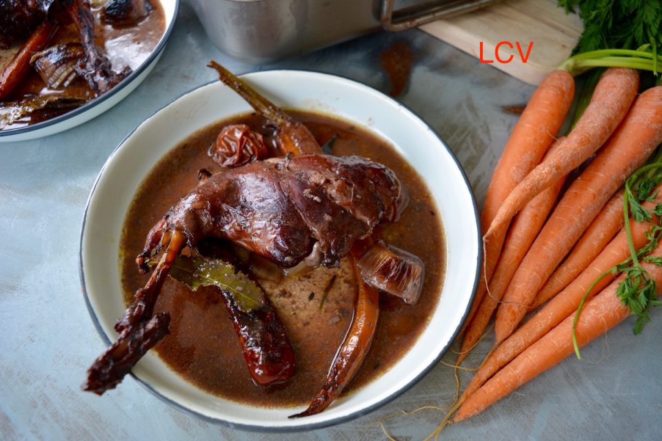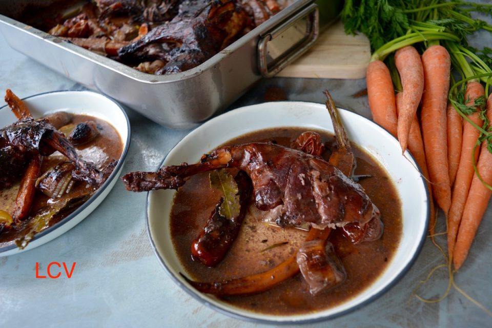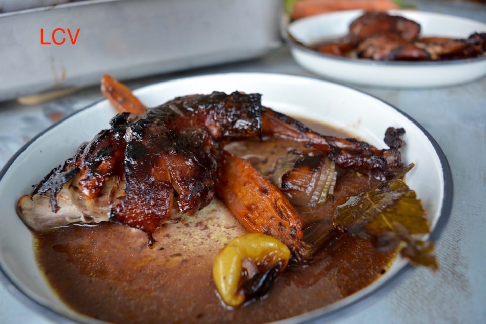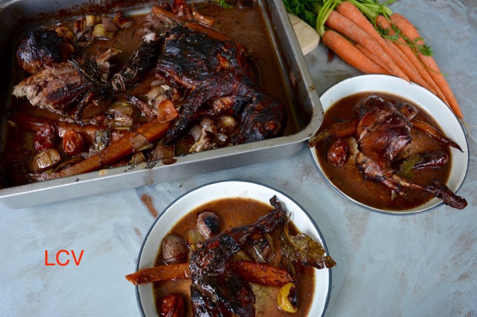 Esta vez no se ha quemado el asado. La tonalidad oscura se la da la salsa con la que hemos pintado el conejo que no es otra que la “Hickory & Brown sugar” de la marca Hunts. En esta ocasión hemos hecho el conejo en el horno pero lo podríamos haber hecho perfectamente en la barbacoa.Y es que la carne de conejo es una de las más saludables, ya sea de caza o de granja, por su bajo contenido en grasas y alto valor proteico. A pesar de que el mayor consumo lo encontramos en la zona de levante, podríamos considerarlo un producto de la dieta Atlántica en vez de Mediterránea ya que la zona de mayor producción se encuentra en Galicia. Hemos acompañado el asado de vegetales que le van a las mil maravillas y aparte del aroma que le aporta la salsa con la que lo hemos pintado, las hierbas aromáticas complementan su sabor. Jugoso por dentro y por fuera tostado pero no, no se nos ha quemado.