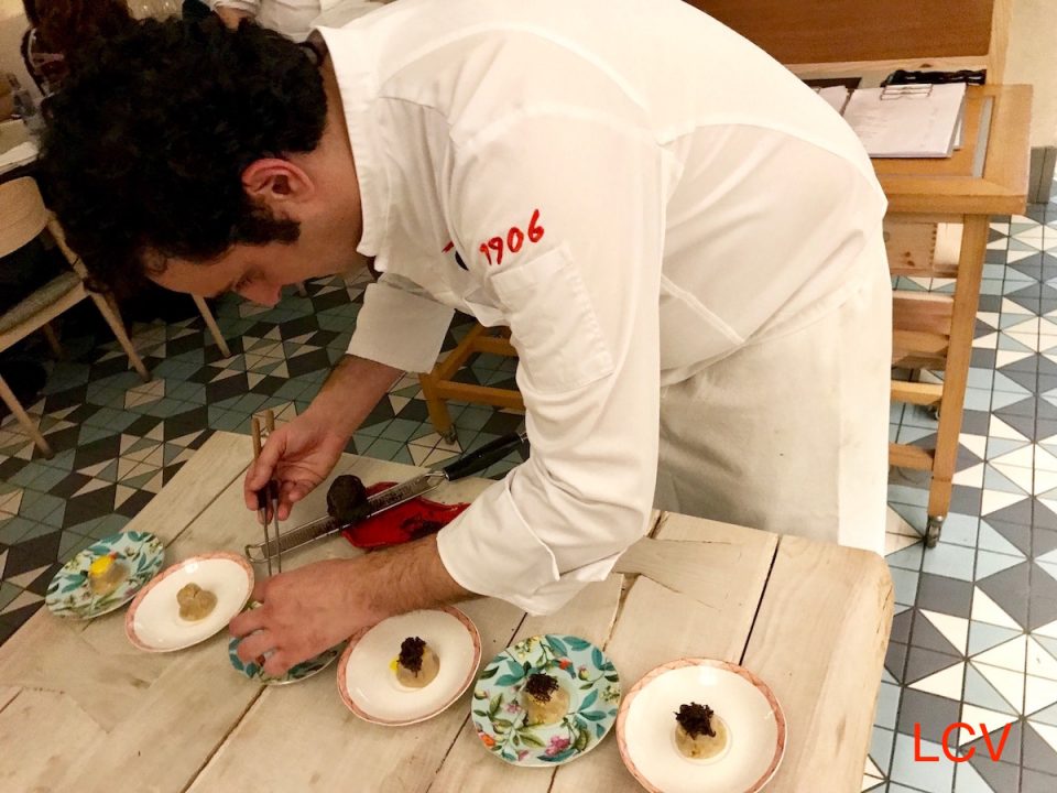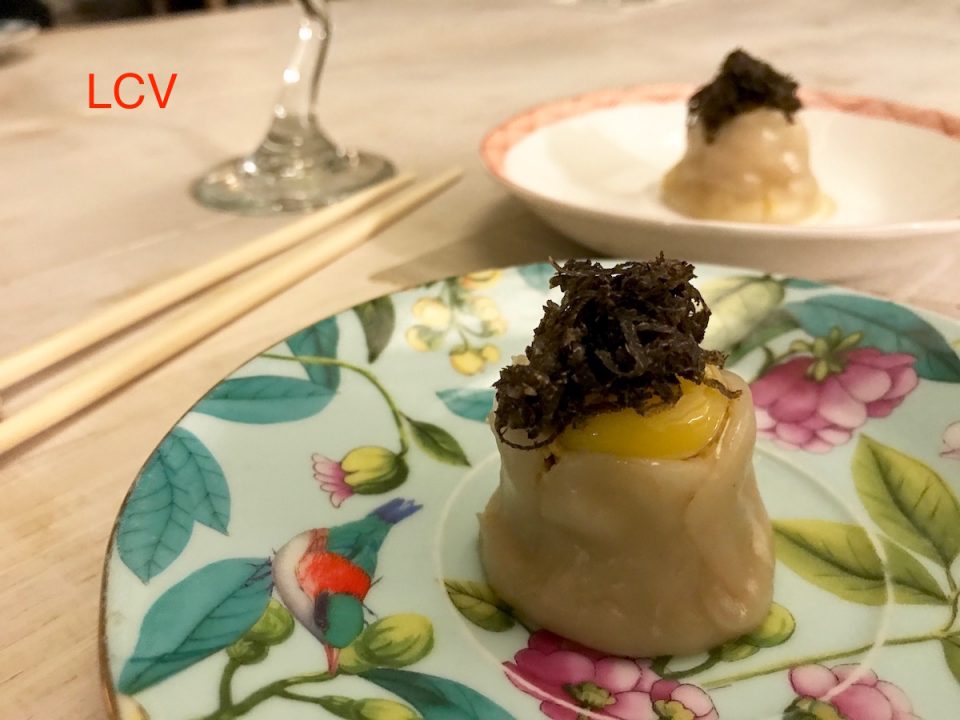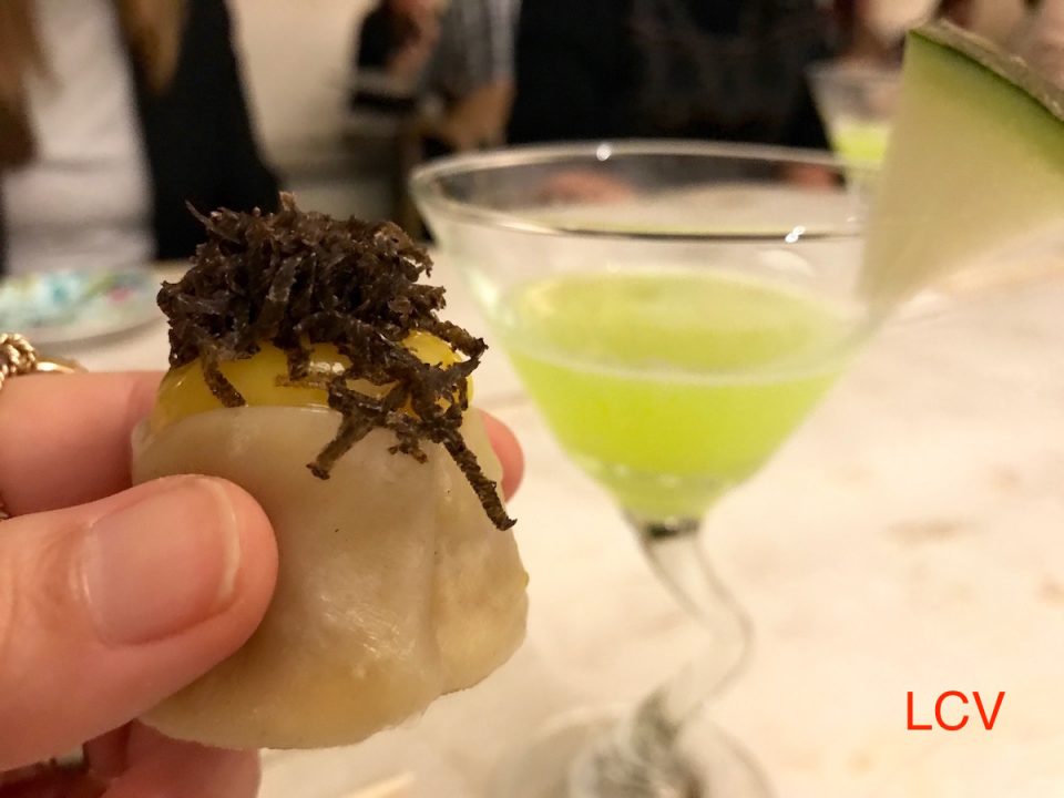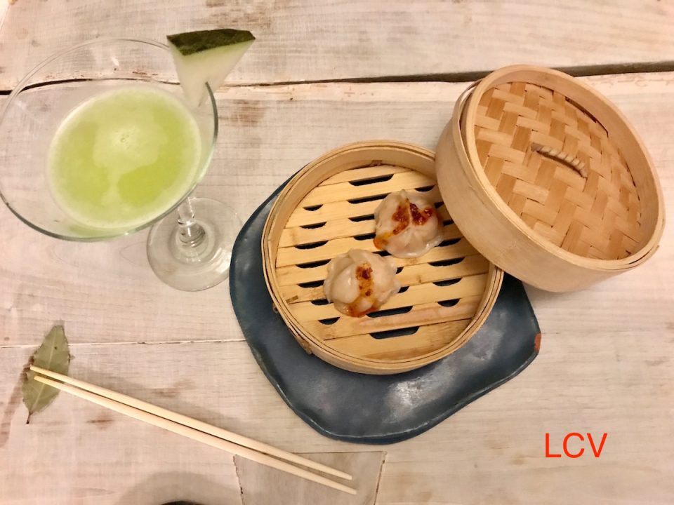 Continuamos con otro Dumpling de pollo de corral y trufa. Pollo gallego de más de 3 Kg. para una ejecución oriental con la elegancia de la trufa. Los dos dumplings los acompañamos con un Sunset melon que ideó Manolo Arias «El Pirata» y que le dio un suave toque dulce con yuzú,licor de melón, ron agrícola y vodka.
