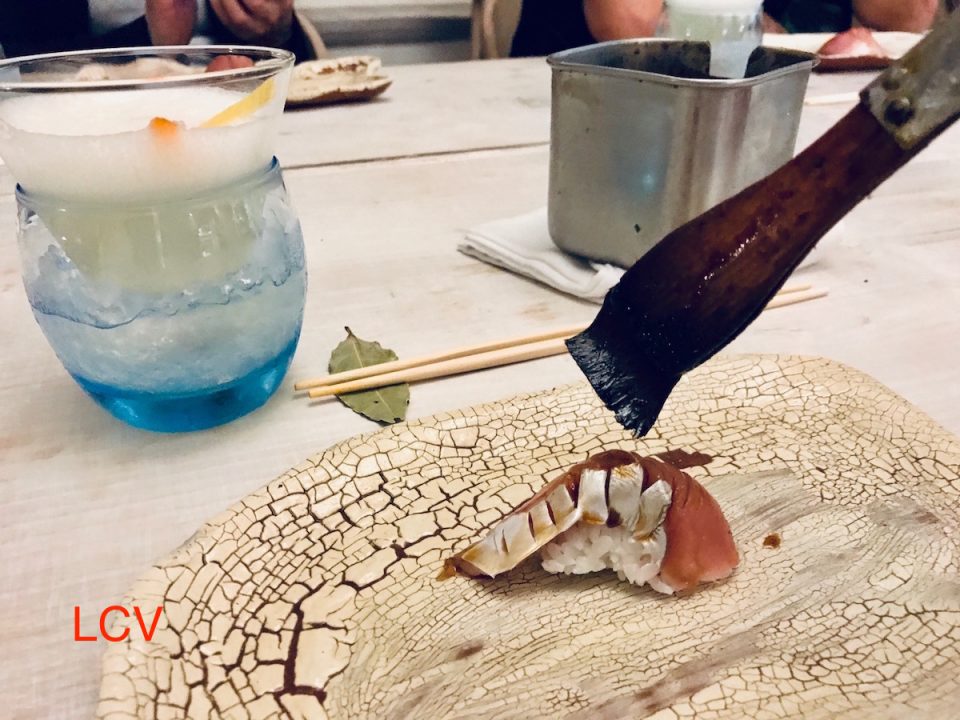 El Nigiri sushi de albacora madurada 15 días se termina en la mesa con una pincelada de soja. Carlos trabaja con técnicas como el reposo de los pescados, que le da una textura y sabor inigualable.