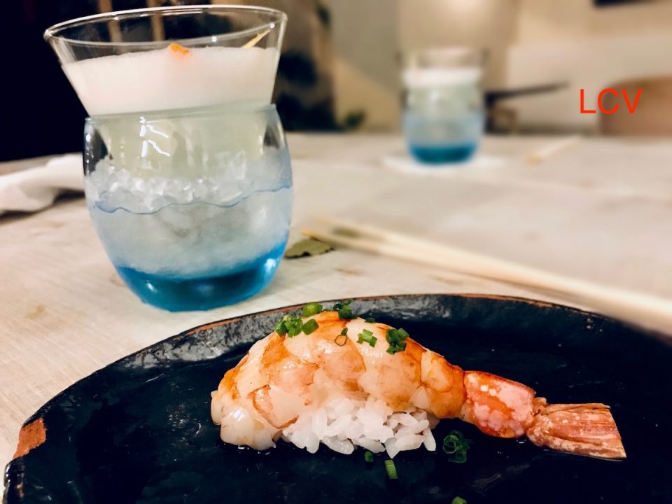 Niguiri sushi de langostino. Sabores del wasabi con grasa de panceta, soja y cebollino inundan el paladar.