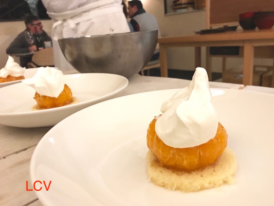 Terminamos con una Mandarina estofada en ron y nata. Sabores cítricos con una textura muy conseguida y nata. La acompañamos de un vino Generoso Tradición. Un maridaje clásico dentro del excepcional menú acompañado por los cócteles de Manolo Arias «El Pirata» Elegancia, fusión y sabré del chef Carlos Pérez.