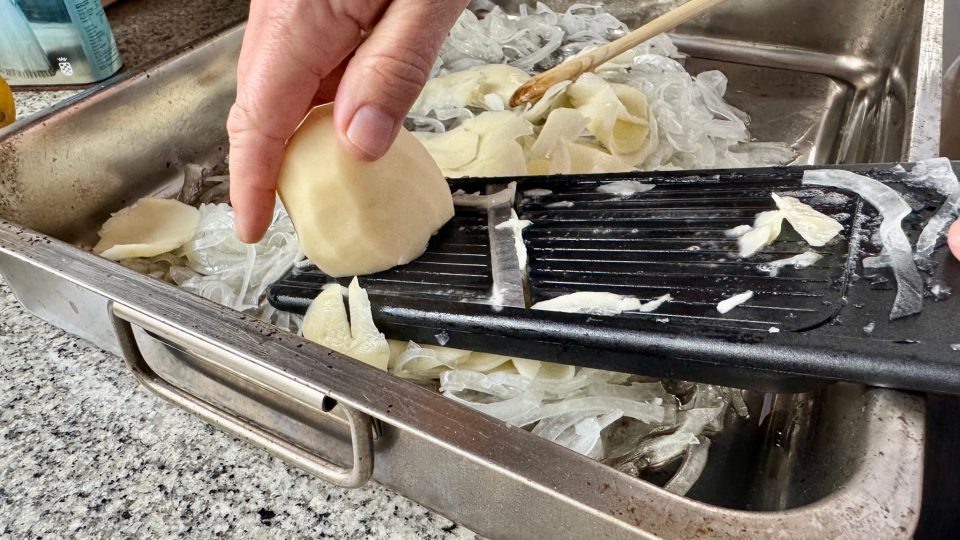 El que una receta sea sencilla no quiere decir en absoluto que no sea sabrosa. Como muestra tenemos a los asados de cordero castellanos que únicamente llevan un poco de ajo, manteca de cerdo, laurel, agua y sal. El resultado es espectacular pero mucha parte de este éxito se la podemos atribuir a un buen hornode leña. Nosotros, como carecemos de él nos hemos arriesgado con esta receta también muy sencilla, con una estupenda paletilla de cordero que hemos encontrado en la sección de carnicería de Gadis, pero en la que la técnica de corte con una mandolina es fundamental. Si tenéis una a vuestro alcance, laminad patatas y cebolla y el resto estará prácticamente hecho. El resultado no tiene nada que envidiar a cualquier asado de un horno de leña.