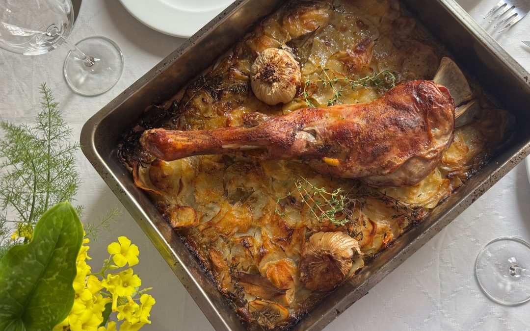 En la misma rustidera mezclamos bien la cebolleta con las patatas y ponemos un trozo de la paletilla trinchada sobre las mismas. Sabor, jugosidad y sencillez en una receta que lo único que requiere un poco de atención por nuestra parte.