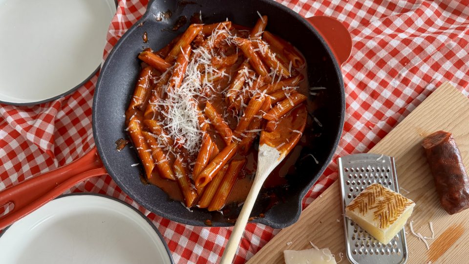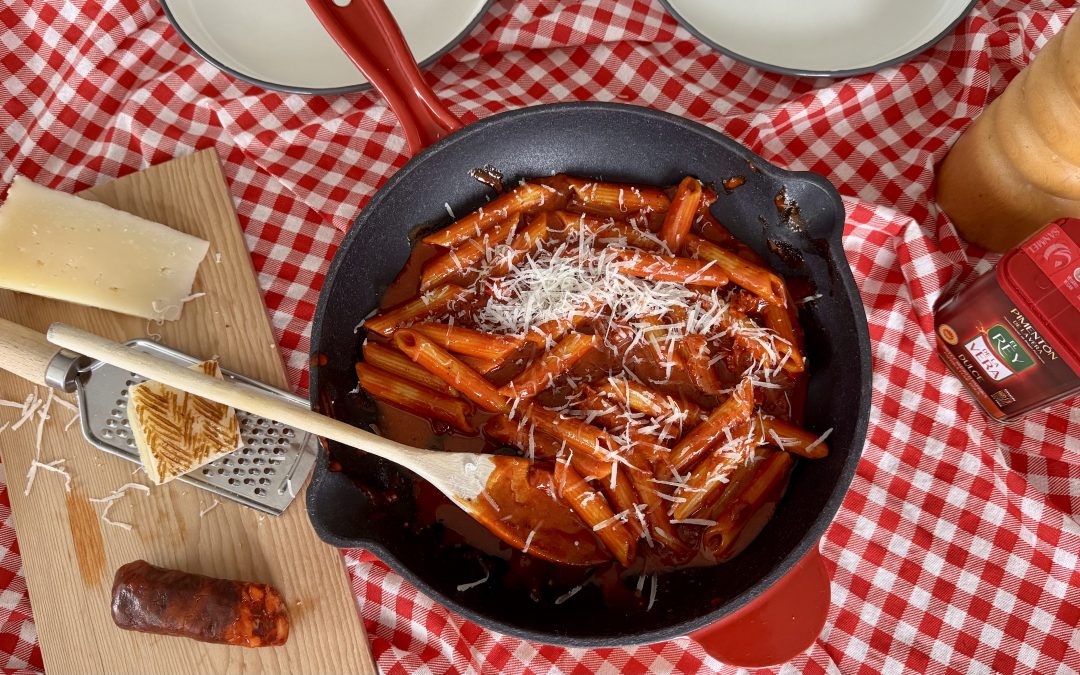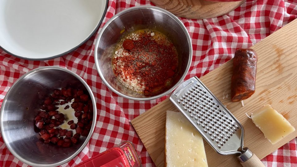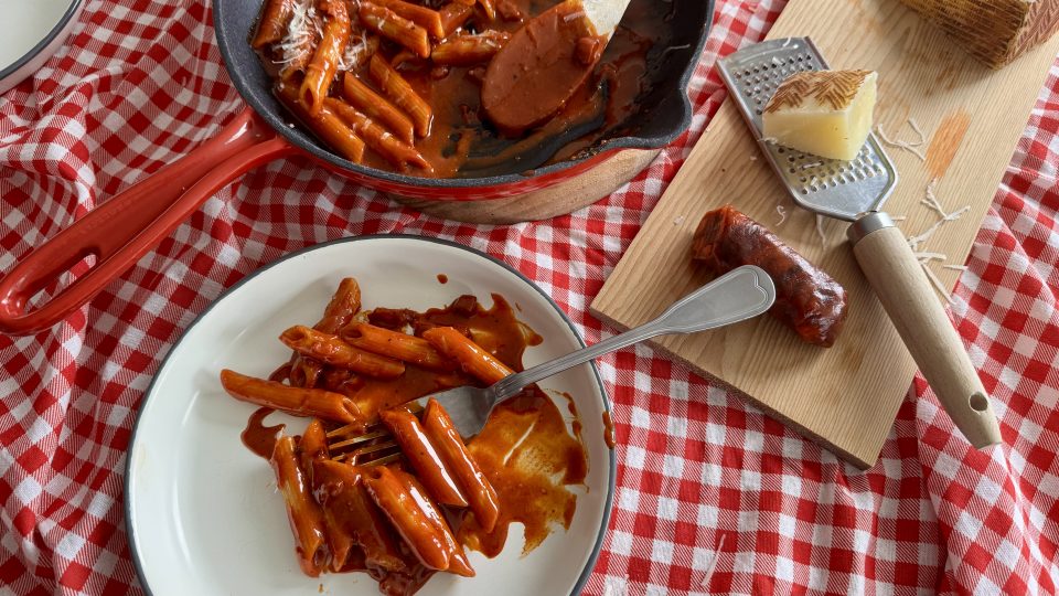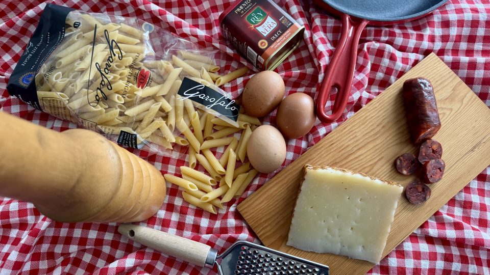 En esta ocasión no vamos a entrar en la eterna polémica de que si la salsa carbonara lleva o no lleva nata. Está claro que los italianos se llevan las manos a la cabeza cuando hablamos de ponerle nata a la carbonara y nosotros estamos totalmente de acuerdo. Cosa distinta es la receta que hoy planteamos, que sería una transformación de la carbonara utilizando productos muy presentes en el recetario español y que hemos encontrado en el Gadis sin problema. Los macarrones con carbonara española son una versión «cañí» y llena de carácter del clásico italiano. La clave reside en sustituir el guanciale por un buen chorizo ibérico, cuya grasa fundida se mezcla con el huevo para crear una crema sedosa. El toque distintivo lo va a aportar el pimentón dulce El Rey de la Vera, que añade un aroma ahumado y un color rojizo irresistible, rompiendo con la palidez tradicional que tiene la salsa. Para culminar, el queso manchego curado rallado aporta esa potencia y salinidad propias de nuestra tierra. Es una fusión rústica, sabrosa y con un alma puramente ibérica.