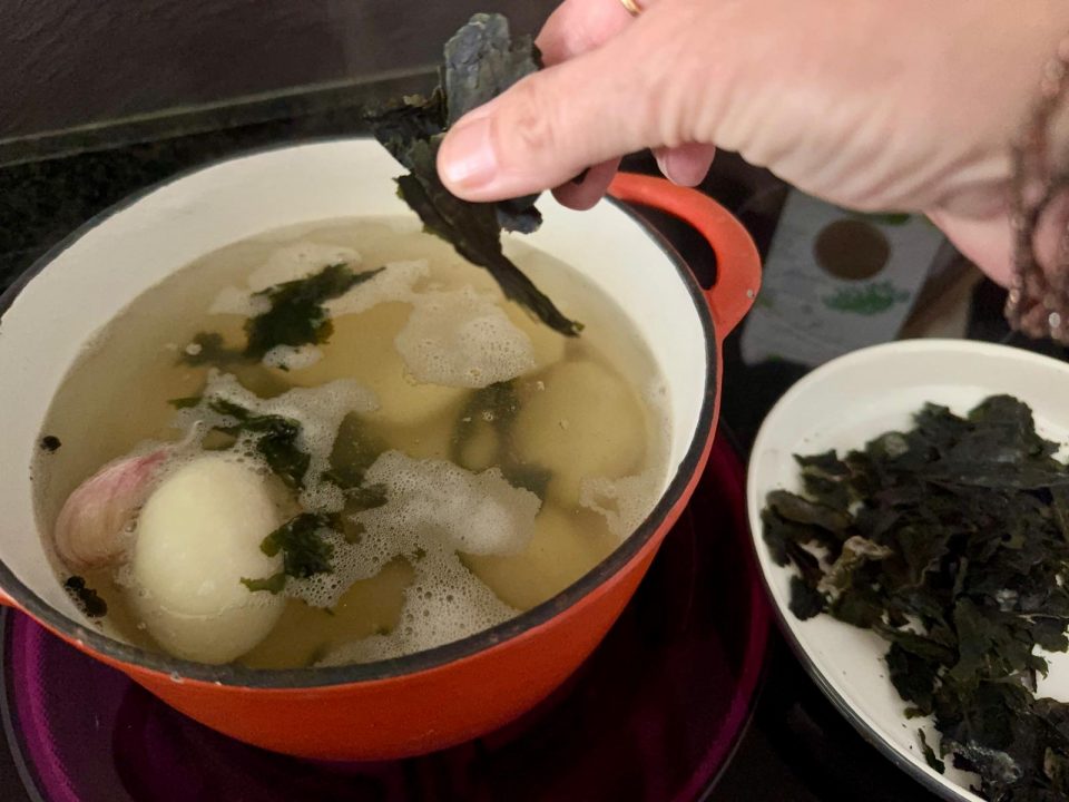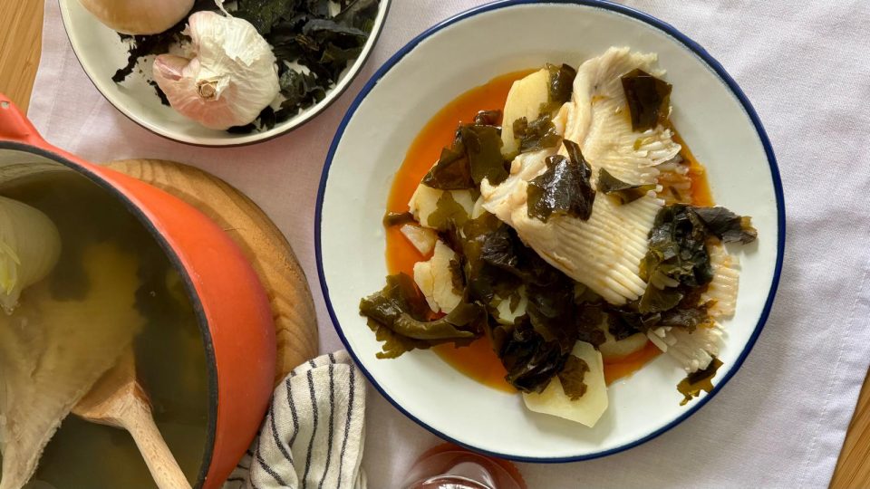 Comenzamos poniendo la patata pelada y cortada en rodajas a hervir en agua con sal junto a las algas, la media cebolla, un diente de ajo, el vaso de vino blanco y un poco de sal. Cuando lleve 15 minutos hirviendo añadimos la raya y la dejamos 5 minutos más. Por otro lado, confitamos el ajo en aceite con una hoja de laurel sin que llegue a hervir durante 20 minutos, añadimos la cucharada de pimentón, un poco de sal y dejamos reposar para que el pimentón se quede en el fondo. Ya sólo nos queda verterlo en un recipiente con cuidado de no echar el pimentón que ha quedado en el fondo.