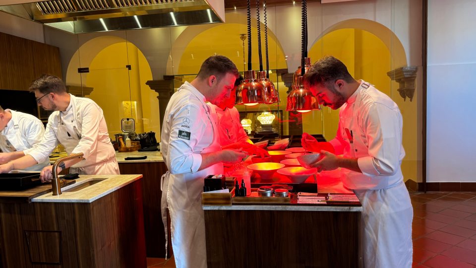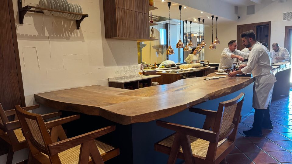 La velada es un ritual. Comienza en el claustro renacentista, bajo arcos de piedra que han visto pasar siglos, donde una copa de fino Jerez actúa como preludio. Luego, el golpe de efecto y es que para llegar al comedor, se atraviesa literalmente el corazón de la casa con la cocina a la vista. Es un gesto simbólico de transparencia total, un permitir al comensal asomarse al taller donde se forja la magia, antes de sentarse a su mesa. Un guiño que disuelve la cuarta pared entre creación y degustación.