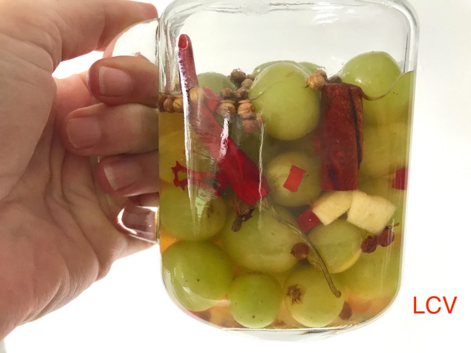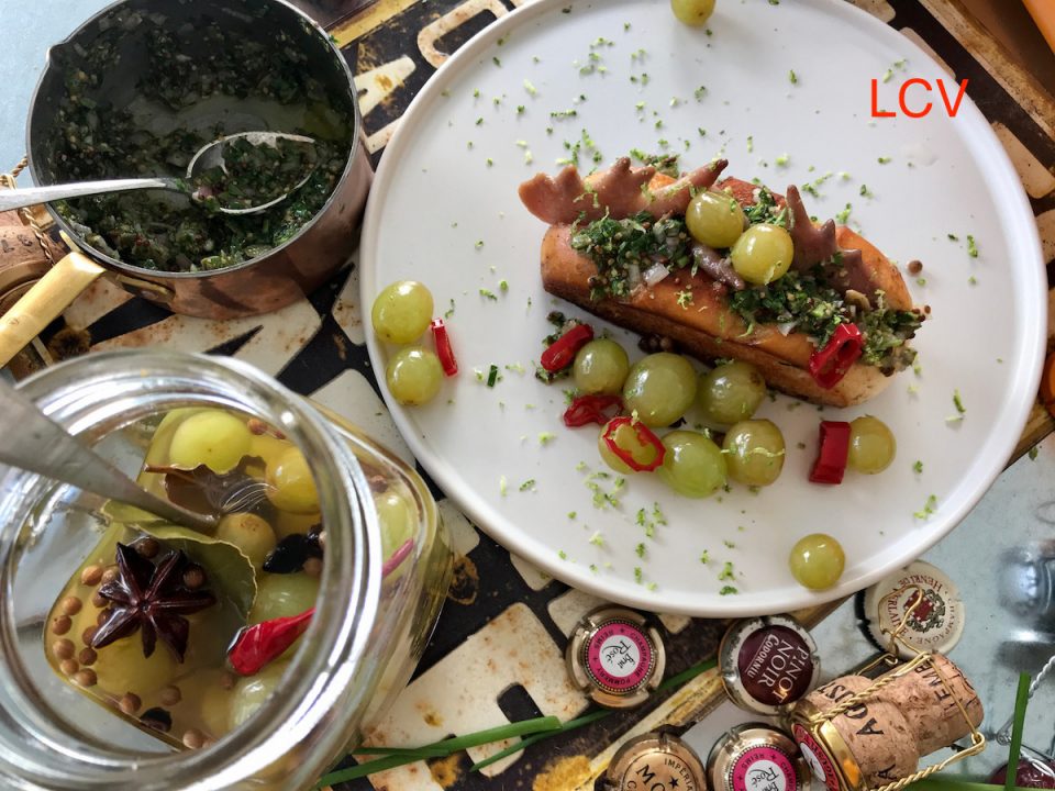 Comenzaremos preparando las uvas encurtidas el día anterior para que puedan estar macerando al menos 24 h. Para ello, infusionaremos todos los ingredientes excepto las uvas sin que lleguen a hervir y cuando enfríen añadiremos las uvas y las dejaremos encurtiendo en el frigorífico hasta el momento de su uso.