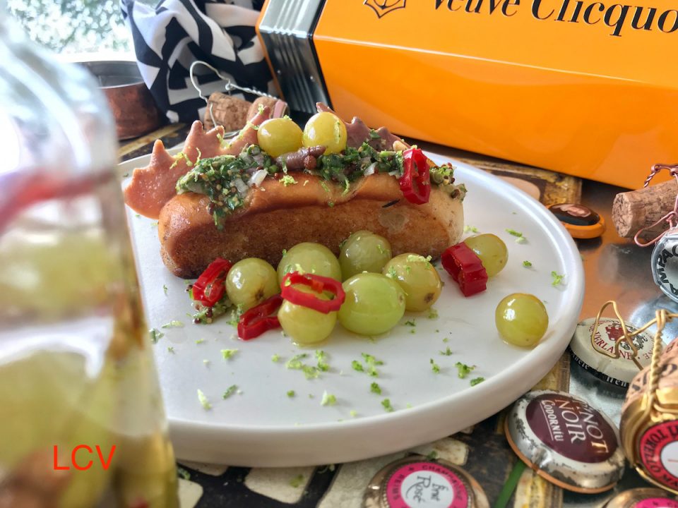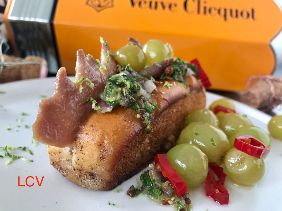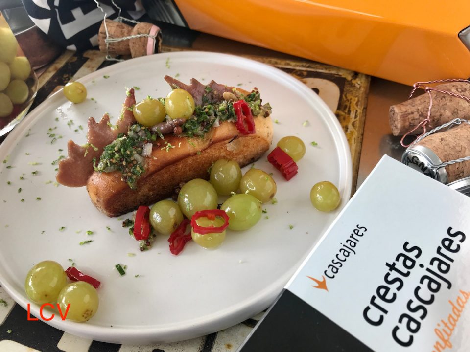 Sí, la verdad es que es un rollo inventarse un nombre para este bocado. La idea es la de un lobster roll, pero en vez de ponerle medallones de langosta, sustituir esta por unas crestas confitadas. Ya puestos, vamos a cambiar la salsa, generalmente una mayonesa o una salsa coktail, por algo más contundente. ¡Ah! Y como es un plato festivo para despedir el año, vamos a respetar la tradición española de las uvas, pero que como las vamos a encurtir van a aportarle un toque fresco, picante y a la vez. Por supuesto que no nos vamos a poner a confitar crestas la noche de fin de año así que nosotros en esta ocasión hemos dejado que Cascajares lo haga por nosotros, que además de hacerlo muy bien nos van a ahorrar el trabajo más duro. El resto, es decir la salsa y las uvas encurtidas, es pan comido. Sólo una cosa, si las crestas están ricas, no me quiero ni imaginar el capón que está por debajo. Sin más, disfrutad de este plato con aire punk, y este año en vez de tacones, poneos vuestras Dr. Martens para darle una buena patada en el culo a este año que finaliza. ¡Feliz 2021!
